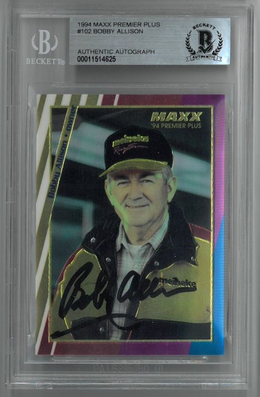This is a Bobby Allison signed NASCAR 1994 Maxx Premier Plus Card #102- Beckett BAS #00011514625. Image of actual item instock - as shown.