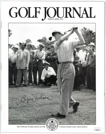 Byron Nelson was an American professional golfer between 1935 and 1946, widely considered one of the greatest golfers of all time. He is mostly remembered today for having won 11 consecutive tournaments and 18 total tournaments in 1945. He retired officially at the age of 34 to be a rancher, later becoming a commentator and lending his name to the HP Byron Nelson Championship, the first PGA Tour event to be named for a professional golfer. Nelson became the second recipient of the PGA Tour Lifetime Achievement Award in 1997, and was inducted into the World Golf Hall of Fame in 1974. Byron Nelson has hand signed this Golf Journal Full Magazine from March/April 1994. JSA #EE60451 with JSA Certificate of Authenticity. Handling/condition as shown