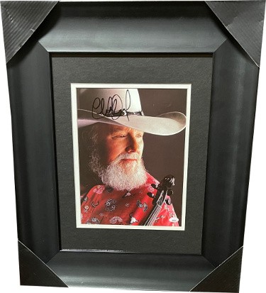 Charlie Daniels was an American musician known for his contributions to country and southern rock music. He was known primarily for his number one country hit "The Devil Went Down to Georgia", and multiple other songs he has performed and written. Daniels has been active as a singer since the early 1950s. He was inducted into the Grand Ole Opry on January 24, 2008. Charlie Daniels has hand signed this 8x10 Photo. JSA Authentication Sticker #RR76721 and JSA Certificate of Authenticity. Custom Double White & Black Mat and Premium Black Frame as shown to overall size 16x19.