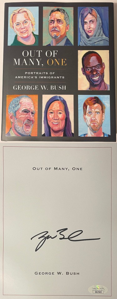 George W. Bush served as the 43rd President of the United States from 2001 to 2009. Nationally, Bush was both one of the most popular and unpopular U.S. presidents in history, having received the highest recorded presidential approval ratings in the wake of the September 11 attacks. Out of Many, One: Portraits of America's Immigrants is a book by George W. Bush published in April 2021. The book includes forty-three oil portraits of American immigrants. It was a New York Times bestseller. President George W. Bush has hand signed this 2021 Out Of Many, One First Edition Hardcover Book. JSA Authentication Sticker #SS17603 and JSA Certificate of Authenticity