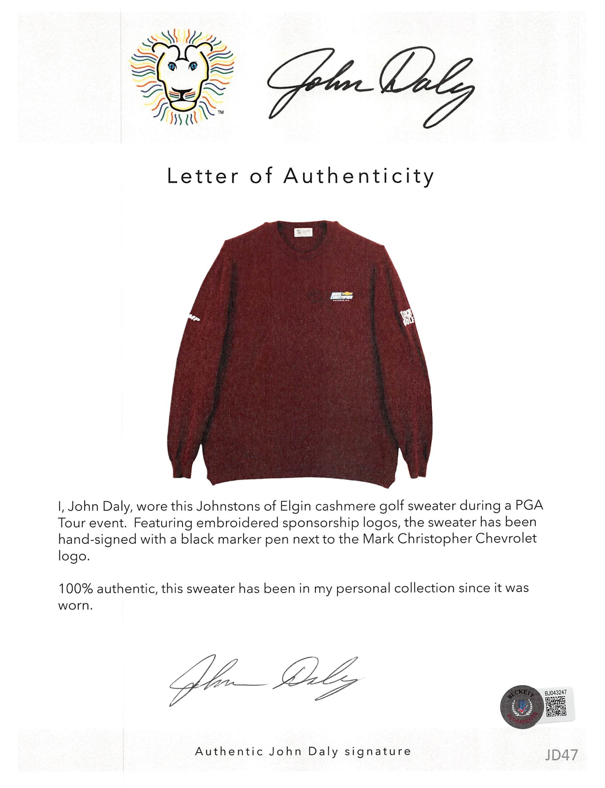 John Daly Autographed Signed Match Worn Maroon Johnstons Of Elgin Cashmere Sweater Beckett. Certificate of Authenticity provided by BAS. Makes a great gift for any collector or sports fan! Items ship quickly and securely.