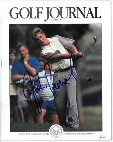 Justin Leonard qualified for the United States Ryder Cup team in 1997, 1999, and 2008. In the 1999 event, Leonard made a 45-foot putt for birdie on the 17th hole to complete a remarkable comeback by the U.S. team on the final day. Justin Leonard has hand this Golf Journal Full Magazine from October 1992. JSA #EE63272 with JSA Certificate of Authenticity. No Label/Handling/condition as shown