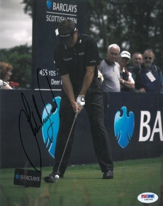 Lee Westwood is one of the few golfers who has won tournaments on every major continent, including victories on the European Tour and the PGA Tour. He was named player of the year for the 1998, 2000 and 2009 seasons. He has won the 2000 European Tour Order of Merit, and the renamed 2009 Race to Dubai. He has represented Europe for the last eight Ryder Cups. In October 2010, Westwood became the World number one golfer, ending the reign of Tiger Woods, and becoming the first British golfer since Nick Faldo in 1994 to hold that position. He held the number one position for a total of 22 weeks. Lee Westwood has hand signed this 8x10 Photo from the Barclays's Scottish Open. PSA hologram and Certificate of Authenticity.