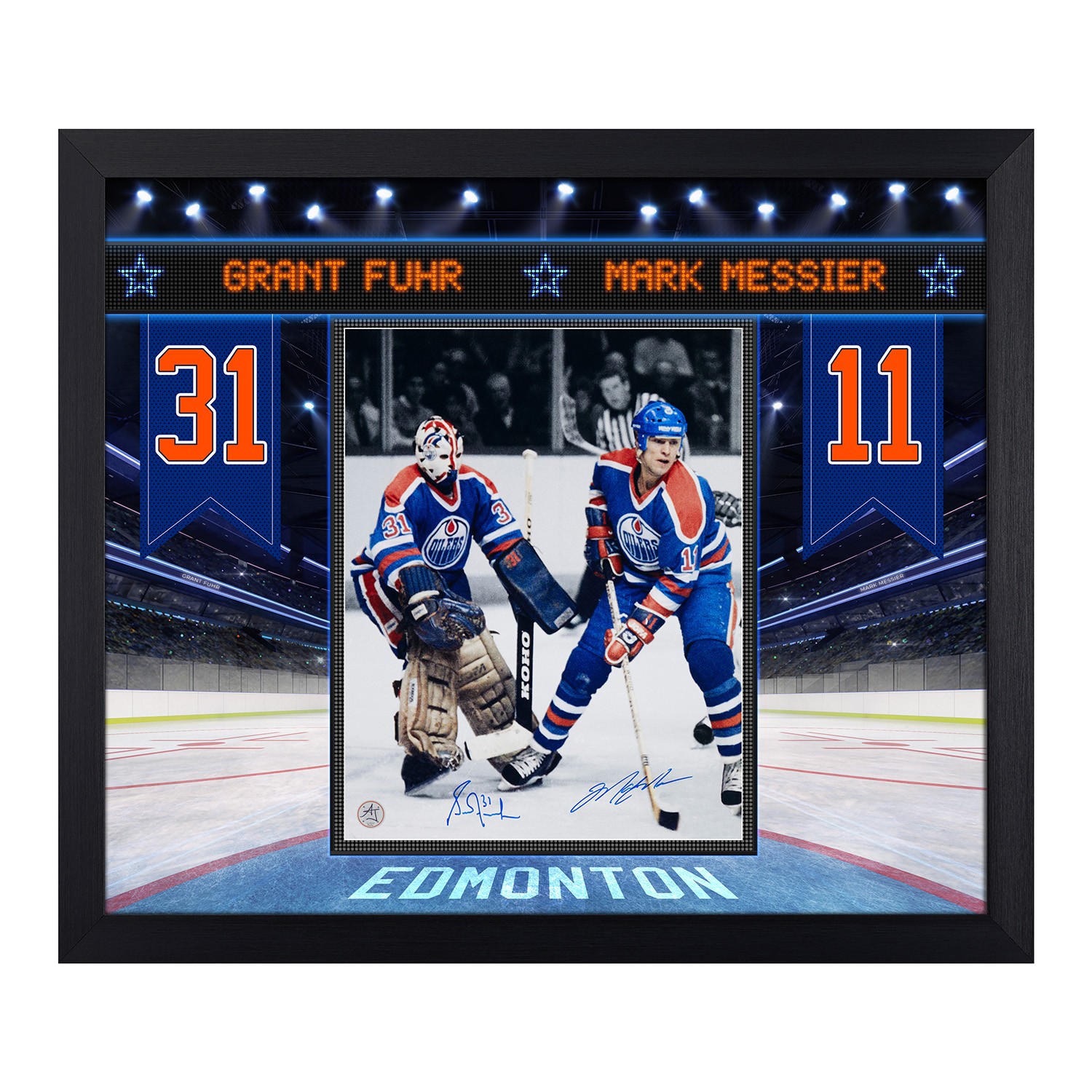 Mark Messier & Grant Fuhr Dual Signed Edmonton Legends 23x27 Frame Edmonton Oilers DualEdmonton Legends 23x27 Frame The 11x14 photo in this frame is hand signed by Mark Messier & Grant Fuhr. Custom design features a franchise legends graphic with arena scoreboard and banners.Photograph of Mark Messier & Grant Fuhr as teammates with the Edmonton Oilers.Framed with glass and premium black composite moulding.Full framed display measures 23"x27".Professionally framed and ready to hang on any wall.Includes a certificate of authenticity and hologram from AJ Sports.Includes AJ Sports certificate of authenticity and hologram. AJ Sports guarantees this autographed memorabilia to be authentic. For your assurance and protection, we promise a money back guarantee if the authenticity of any item we sell is considered doubtful. Guarantee valid unless the hologram, item, or documentation have been altered.