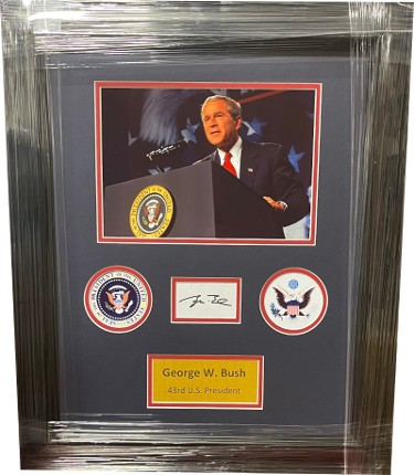 George W. Bush served as the 43rd President of the United States from 2001 to 2009. He was also the 46th Governor of Texas from 1995 to 2000. Nationally, Bush was both one of the most popular and unpopular U.S. presidents in history, having received the highest recorded presidential approval ratings in the wake of the September 11 attacks, as well as one of the lowest approval ratings during the 2008 financial crisis. President George W. Bush has hand signed this Bookplate/Cut Signature Custom Framed w/ 7.5x10.5 Photo/Presidential Seals to overall size of 20x24. Passed Beckett Review Order ID #28127 and Review Order Item ID #33308