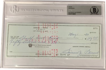 Sam Snead was one of the top players in the world for most of four decades. Snead won seven majors: three Masters, three PGA Championships and one British Open. Sam Snead has hand signed this Bank Check Signed In Blue Beckett BAS #0010734636.