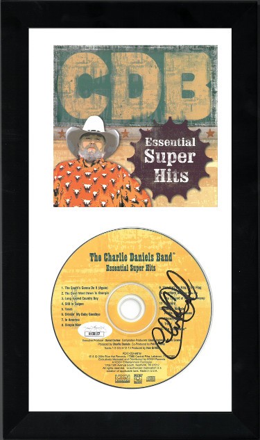 Charlie Daniels was an American musician known for his contributions to country and southern rock music. He was known primarily for his number one country hit "The Devil Went Down to Georgia", and multiple other songs he has performed and written. Daniels had been active as a singer since the early 1950s. He was inducted into the Grand Ole Opry on January 24, 2008. Charlie Daniels has hand signed this2004 Essential Super Hits Album CD w/ Cover. Custom White Mat and Black Frame as shown to overall size 6.5 inch x 12 inch. Comes Complete with Case & Signed DVD (DVD is signed upside down). JSA Authentication Sticker #KK58157 with JSA Certificate of Authenticity. Handling/condition as shown.
